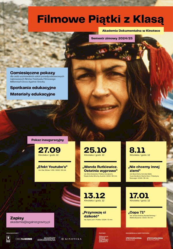 25.10 (piątek), Kinoteka, godz. 12. „Wanda Rutkiewicz. Ostatnia wyprawa", reż. Eliza Kubarska, Polska, Szwajcaria, Nepal, Indie, Włochy, Austria 2024, 80 min. + spotkanie edukacyjne z Michałem Tęczą i Gabrielą Juszczuk
