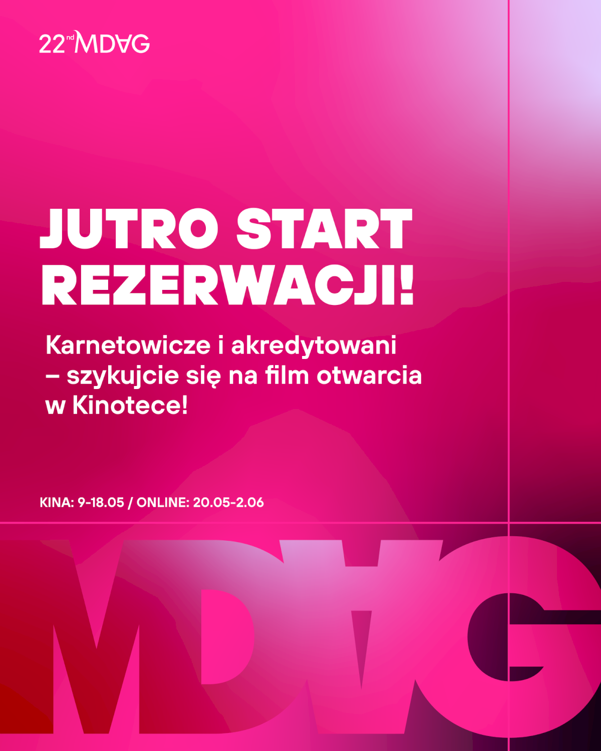 Wejściówki dla osób posiadających karnet lub akredytację będzie można rezerwować na stronie www.book.mdag.pl już od 7 maja od 8:00 po uprzednim zalogowaniu się. Zawsze na dany dzień i dzień kolejny. Jeśli lubicie tradycyjne metody, to osobiście możecie je odebrać w Centrach Festiwalowych we wszystkich festiwalowych kinach w Warszawie (poza Państwowym Muzeum Etnograficznym).